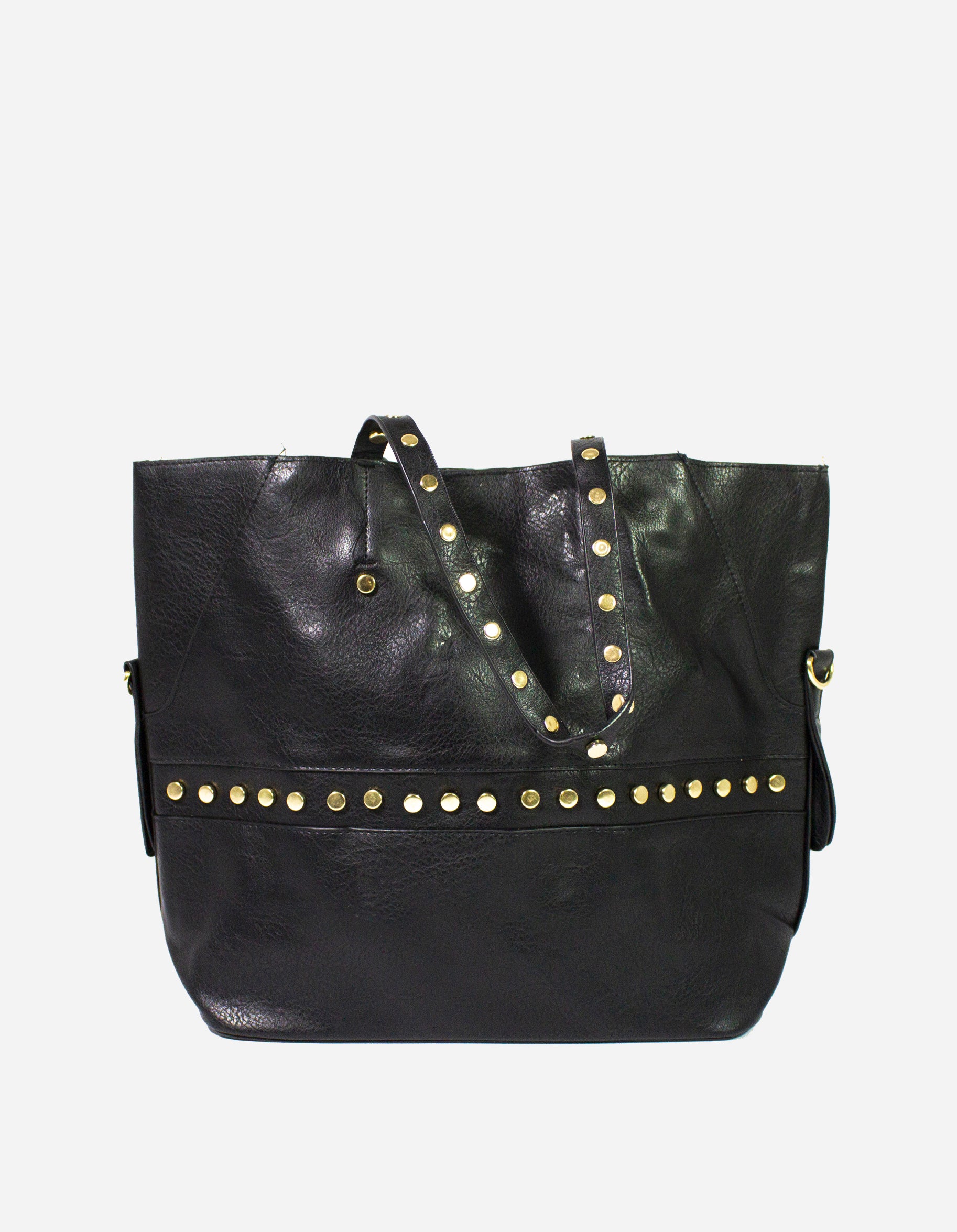 Questa shopping bag è impreziosita da borchie che donano un look molto particolare. La similpelle conferisce morbidezza al tocco con il tracollino pratico e la taschina interna per il massimo comfort. Ideale per un look pratico. + BORSELLO INTERNO