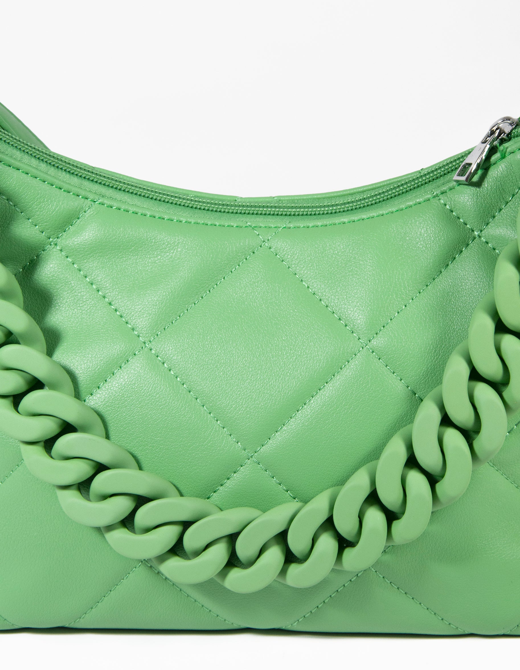 Borsa a mano con tracolla e manico a catena, presenta una trama effetto matelassè in morbida similpelle dalle finiture accurate. Scomparto principale con zip, tasca interna e tasca di servizio con zip.